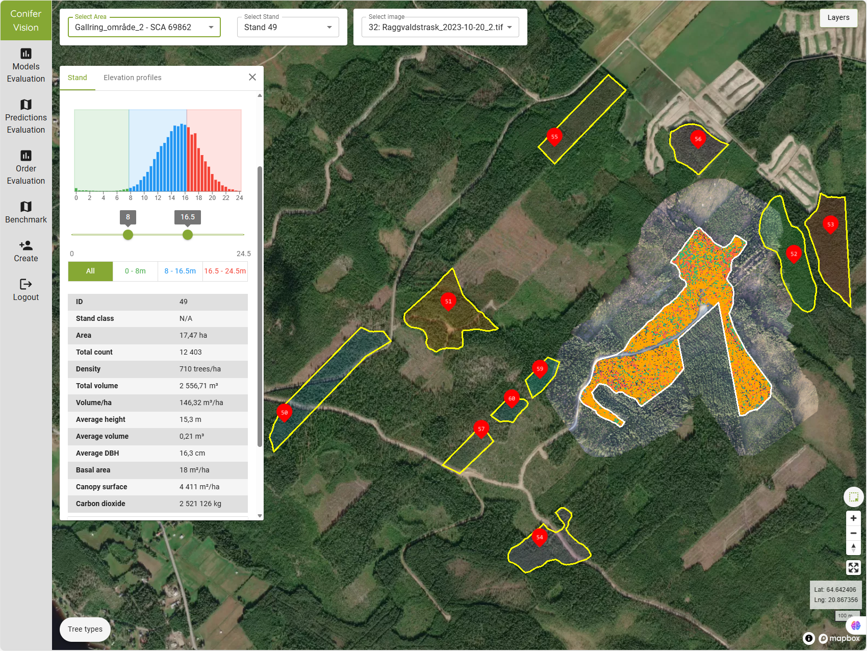I gallringsfasen kan Conifer Vision analysera fuktförhållanden, variationsmönster och lokala artfördelningar. Gallringsanalysen mäter varje träds krontäckning och beräknar hur mycket koldioxid det bundit under sin livstid. När det är dags för avverkning finns detaljerad information om kubikvolym, medelhöjd, stamdiametrar och total Co2-lagring.